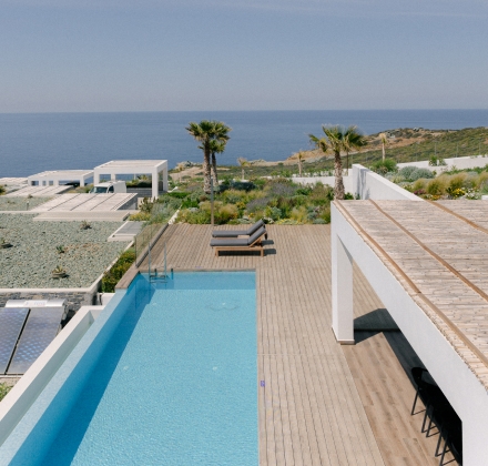 Rock Bay Villas is a private complex of four villas with panoramic sea views. Located on the cliffs of Crete, the villas offer privacy, comfort and a calm setting with direct access to a private bay. Each villa includes spacious terraces, a shaded pergola with a kitchen and grill, dining areas and a fresh-water pool.